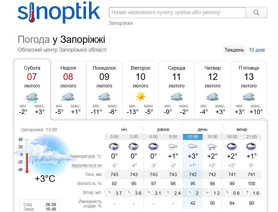 Початок лютого в Запоріжжі видався по-справжньому зимовим — із нічними морозами до –10…–13 градусів та холодним вітром. Проте, за прогнозами синоптиків, холодний період поступово завершується. Вже сьогодгні у Запоріжжі справжня відлига – температура повітря вдень становитиме +3..+4°C градуси. Однак вже завтра, 8 лютого, очікується з обіду зниження температури повітря нижче 0°C Найхолодніше буде 9-10 лютого, вночі – до -10..-13 градусів морозу, вдень від -4 до – 7°C.