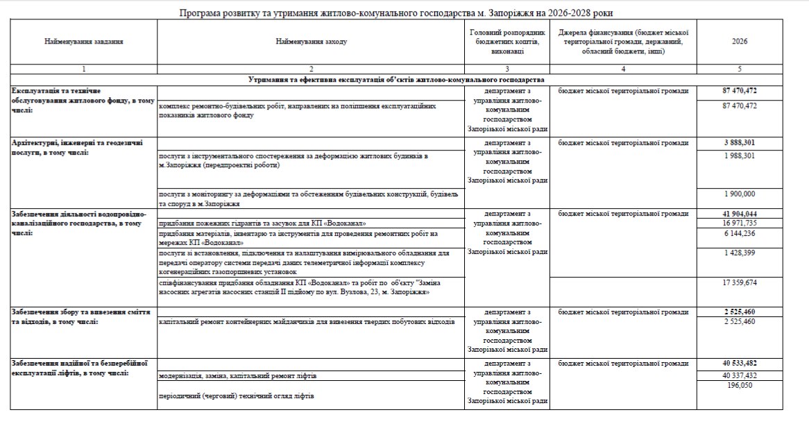 Запорізька міська рада розгляне проєкт рішення про внесення змін до Програми розвитку та утримання житлово-комунального господарства міста на 2026–2028 роки. Документ передбачає коригування додатків до чинної програми та перерозподіл коштів без збільшення загального бюджету. Загалом на сферу ЖКГ у найближчі три роки планують спрямувати понад 4,27 млрд грн.