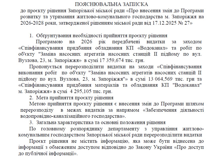 Окремо в пояснювальній записці наголошується на перерозподілі коштів у межах напряму водопровідно-каналізаційного господарства.