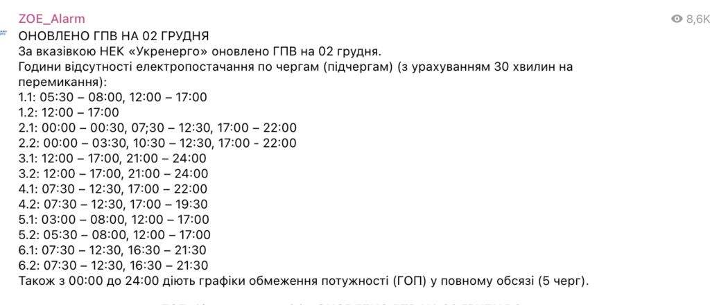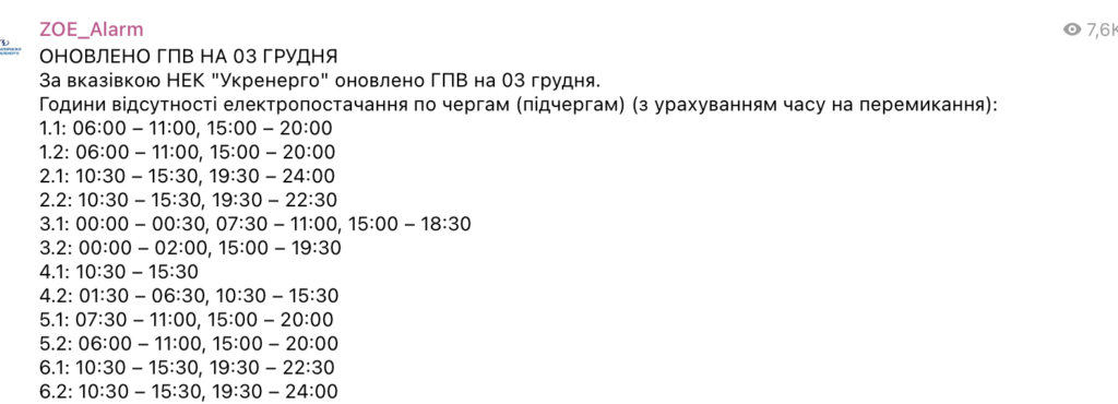 Навантаження на черги 3.1 та 3.2 також зростає – у них вечірні відключення до 24:00.