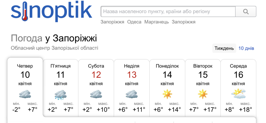 Після кількох похмурих та дощових днів у Запоріжжі нарешті очікується потепління. Якщо 10 та 11 квітня температура триматиметься на рівні +7°C, а небо вкриватимуть хмари, то вже з понеділка 14 квітня погода суттєво покращиться.