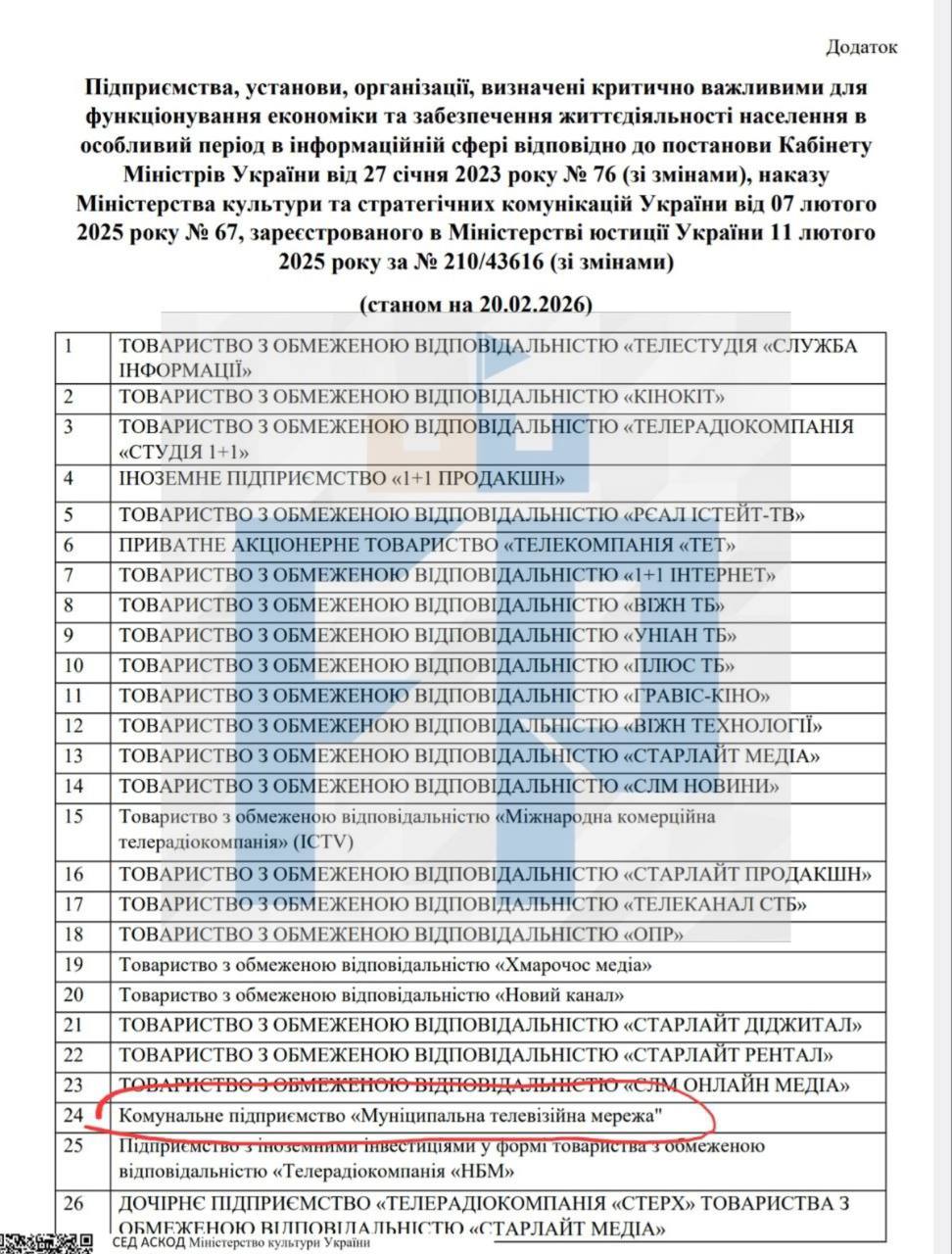 Про це йдеться в повному списку, оприлюдненому відомством 13 березня 2026 року. Статус дозволяє бронювати до 50 % військовозобов’язаних працівників (а в окремих випадках більше), забезпечує пріоритетне електроживлення під час відключень та спрощує ввезення техніки для мовлення – від передавачів і генераторів до супутникового обладнання.