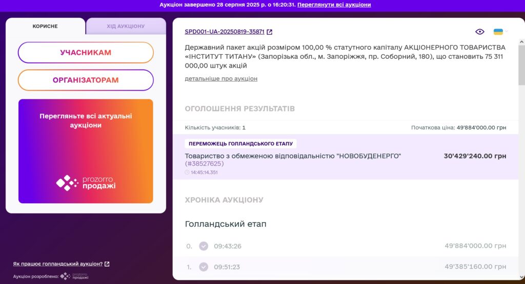 Після року безрезультатних спроб Фонд державного майна України зміг реалізувати 100% акцій Запорізького інституту титану. Єдиним учасником аукціону стала волинська компанія «НОВОБУДЕНЕРГО», яка придбала об’єкт за 30,4 млн грн разом із боргами підприємства понад 72 млн грн.