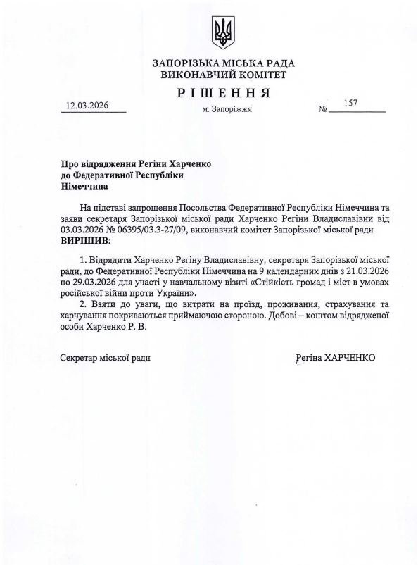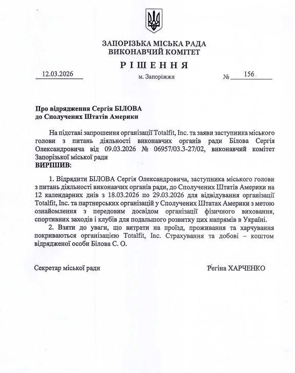 12 березня у виконавчому комітеті міської ради Запоріжжя погодили закордонні відрядження для в.о. мера Регіни Харченко і її заступника Сергія Білова. Відповідні рішення оприлюднили на сайті мерії у вівторок, 17 березня.